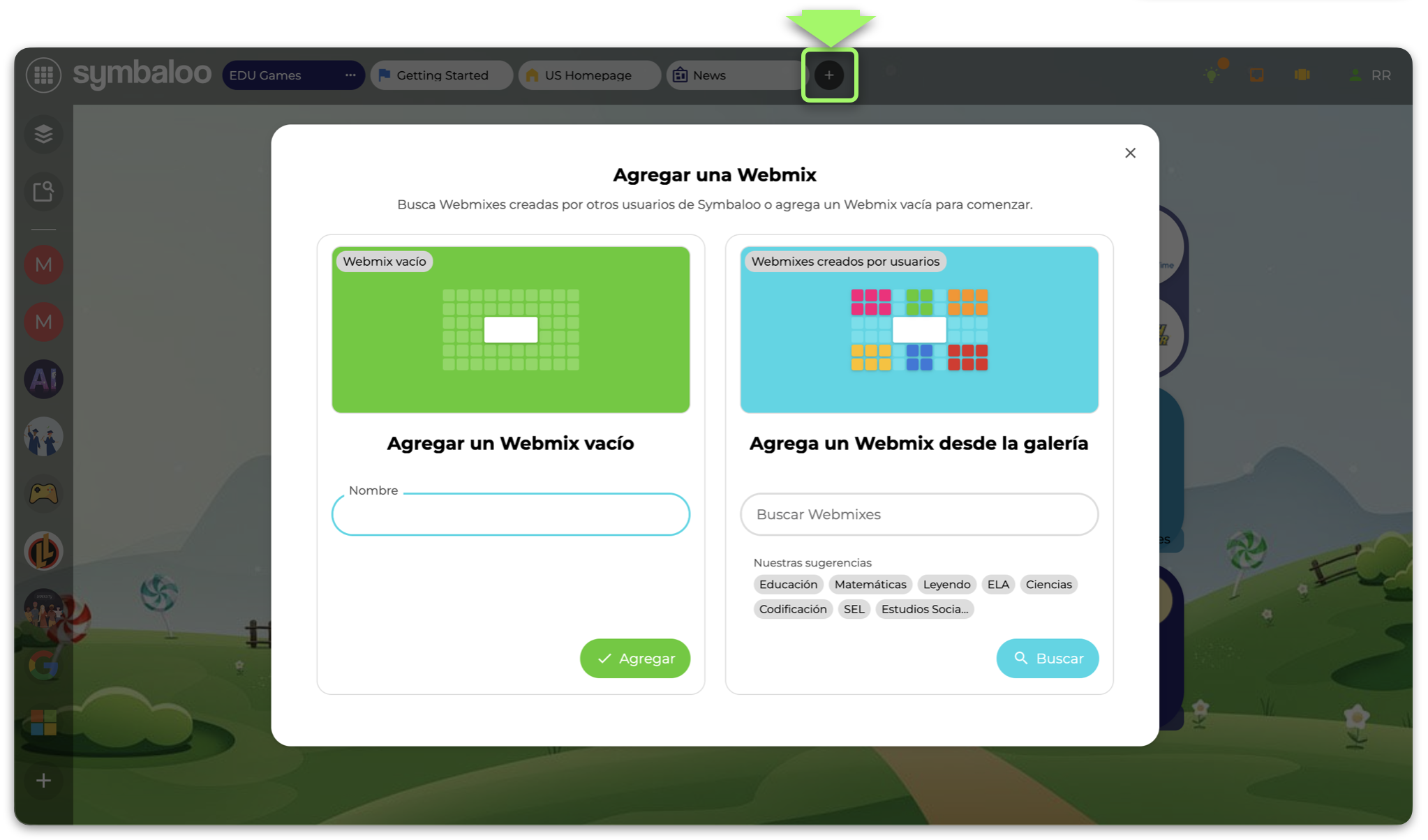 Haz clic en el signo de más (+) ubicado al extremo derecho de las pestañas de tus Webmixes (en la parte superior de la pantalla).
